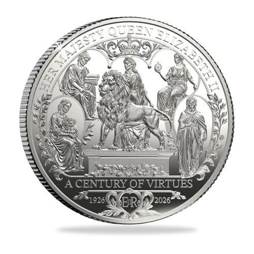 Struck in One Full Ounce of 999/1000 Fine Silver to the highest Proof finish, the magnificent NEW ‘Century of Virtues’ issue embodies the core values which Her Majesty demonstrated throughout her remarkable reign from 1952 until 2022. The new coin’s design features five females dressed in long robes in the style of ancient goddesses. In the centre represented as ‘Dignity’ stands the monarch next to a Lion, strong and courageous (echoing Wyon’s Una and the Lion design) while also featured are figures symbolising ‘Faith’, reading a prayer book, ‘Compassion,’ nursing a child, ‘Constancy’ holding a compass to signify steadfastness and in the bottom right, ‘Duty,’ rejecting the weight of responsibility.