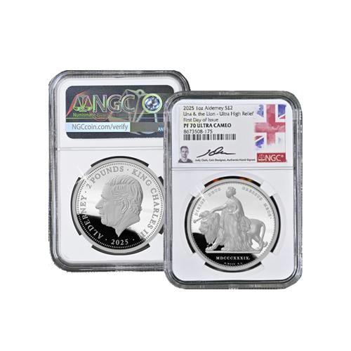 Struck in 1oz of 999/1000 Fine Silver to a pristine Proof Finish, following its approval at Buckingham Palace, the new Una & the Lion 1oz Fine Silver Proof Ultra High Relief Coin features a flawless PF70 finish, as officially graded and independently verified by NGC, the world’s largest coin grading provider since 1987. Just like Wyon’s original, the design depicts the monarch holding the ceremonial Sceptre to guide the lion at her side which, on this 2025-dated issue, has been skilfully modelled, to enhance its finer details, in beautiful ‘Ultra High Relief’ (up to 6 or 7 times the usual relief height) by Jody Clark, best-known for the UK’s final official QEII definitive coin effigy.